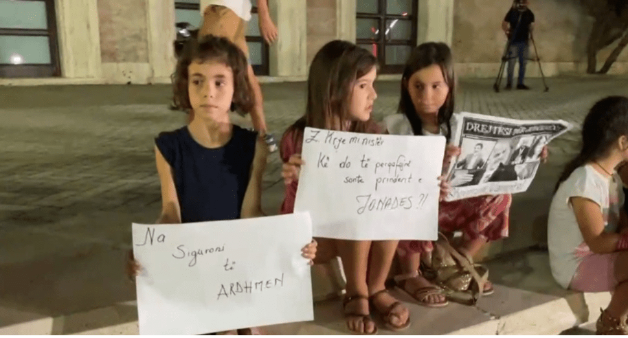 Qytetarët janë ulur në Bulevardin “Dëshmorët e Kombit”, ndërsa një grup fëmijësh janë ulur në shkallët e Kryeministrisë me pankarta në duar.