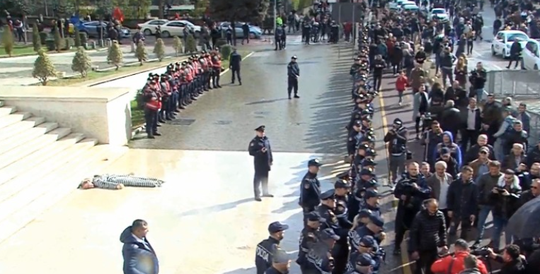Disa prej tyre dëmtuan një manekin i cili ishte veshur si i burgosur, me fytyrën e Ramës.