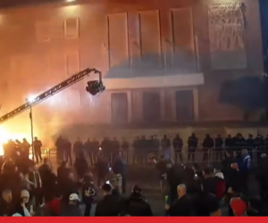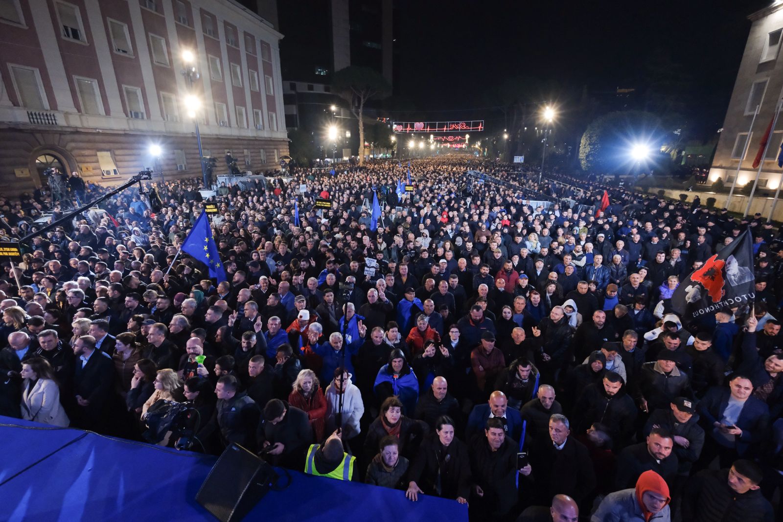 Pas fjalës së ish-kryeministit Sali Berisha, protestuesit kanë hedhur kapsolla në shkallët e godinës së kryeministrisë.