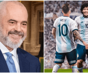 Një veshje e dhënë pak çaste më parë nga presidenti i FIFA-s, Gianni Infantino dhe emiri i Katarit, Tamim bin Hamad Al-Thani.