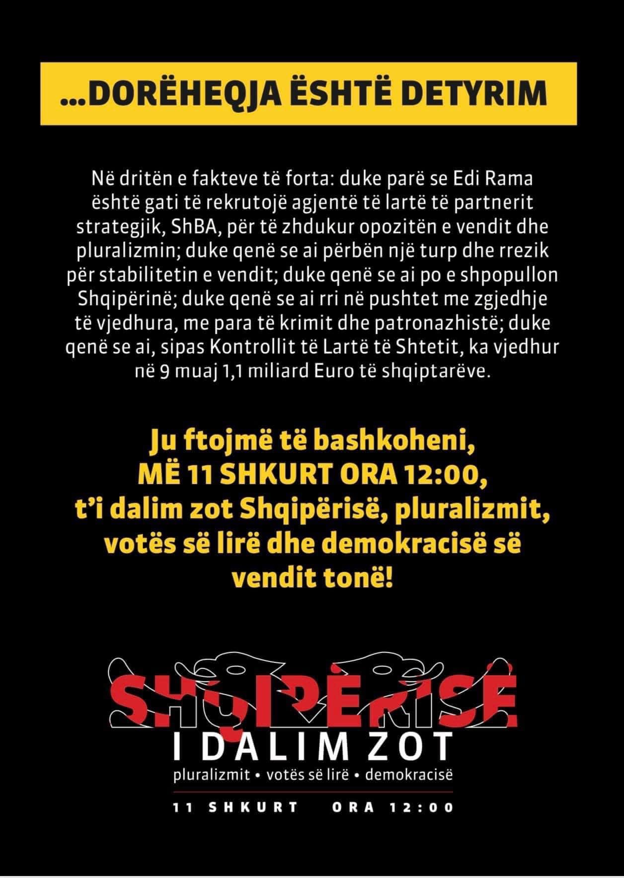“Në dritën e fakteve të forta: Duke parë se Edi Rama është gati të rekrutojë agjentë të lartë të partnerit strategjik, SHBA, për të zhdukur opozitën e vendit, pluralizmin; duke qenë se ai përben një turp dhe rrezik për stabilitetin e vendit; duke qenë se ai po e shpopullon Shqipërinë; duke qenë se ai rri në pushtet me zgjedhje të vjedhura, me para të krimit dhe patronazhistë; duke qenë se ai sipas KLSH ka vjedhur në 9 muaj 1.1 mld euro të shqiptarëve. Ju ftojmë të bashkoheni më 11 shkurt ora 12:00, t’i dalim zot Shqipërisë, pluralizimit, votës së lirë dhe demokracisë së vendit tonë”, thuhet ndër të tjera në këtë slogan që do të udhëheqë opozitën në shesh më 11 shkurt.