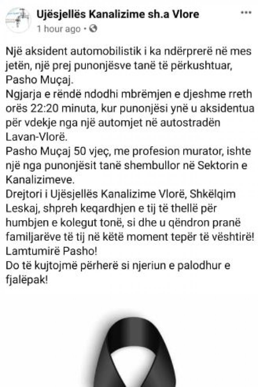Ngjarja e rëndë ndodhi mbrëmjen e djeshme rreth orës 22:20 minuta, kur punonjësi ynë u aksidentua për vdekje nga një automjet në autostradën Lavan-Vlorë.