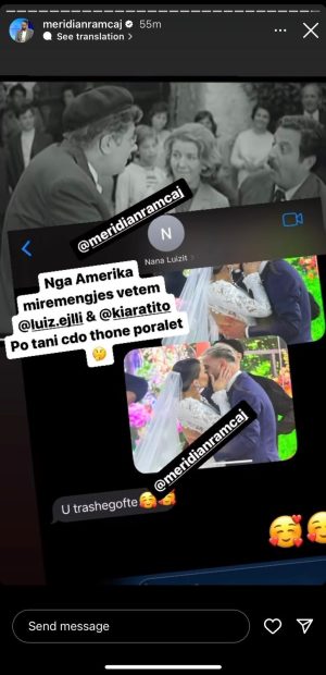 Miku i tij, Meridian Ramçaj, ka publikuar në Instastory një foto të shkëputur nga mesazhet që ka shkëmbyer me nënën e Luizit. Ish-banori i “BBV1”, i kishte dërguar asaj fotot nga “dasma” e Luizit dhe reagimi i saj ishte urimi: “U trashëgofshin”, shoqëruar me disa emoji plot dashuri.