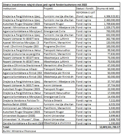 Sipas të dhënave nga dega e thesarit në Ministrinë e Financave fondet janë ngrirë për reformën e ujit, menaxhimin e mbetjeve, emergjencat civile dhe transportin rrugor, detar dhe hekurudhor, fondet për rininë dhe shumë projekte të tjera.
