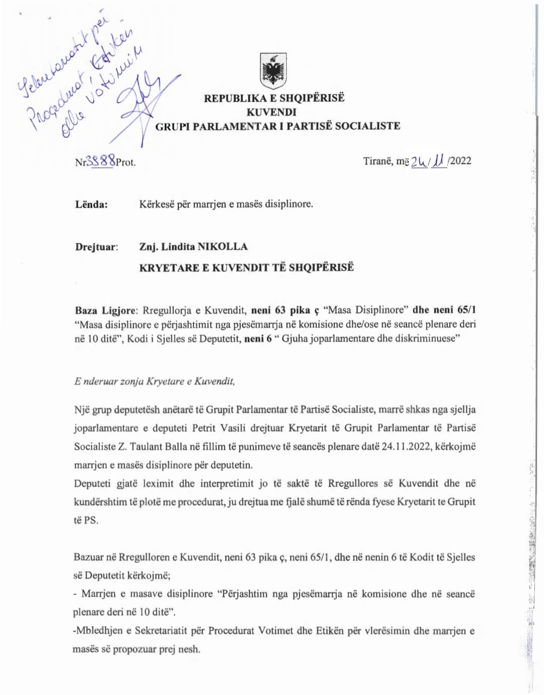 Në zbatim të nenit 63 pika ç dhe nenit 65/1 të Rregullores së Kuvendit, Sekretariati vendosi me 3 vota Pro, marrjen e masës disiplinore “Përjashtim nga pjesëmarrja në komisione dhe në seancë plenare për 5 (pesë) ditë” për deputetin z. Petrit Vasili.