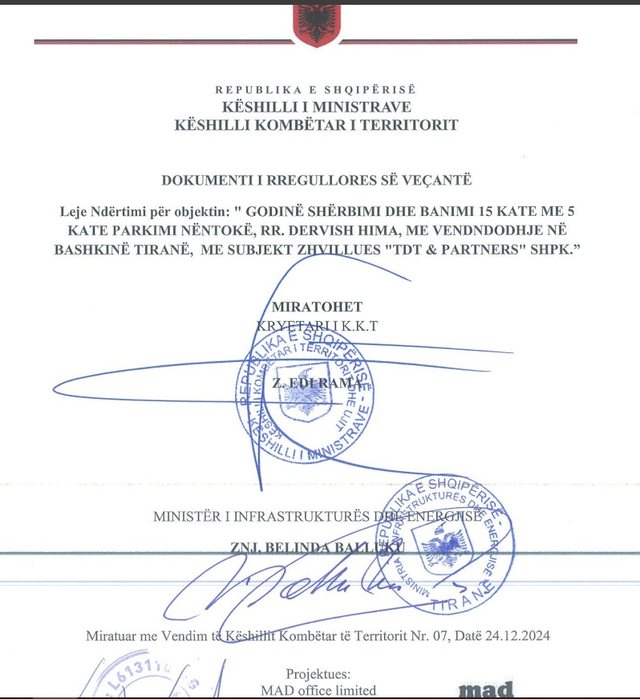 VoxNews ka siguruar dokumentet e kësaj leje, e cila bën fjalë për miratimin e një leje ndërtimi për objektin “godinë shërbimi dhe banimi 15 kate me 5 kate parkimi nëntokë, në rrugën ‘Dervish Hima’, me vendndodhje në bashkinë Tiranë, me subjekt zhvillues ‘Tdt & Partners’ shpk”.