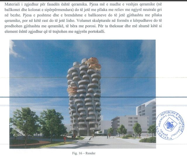 Në lejen e ndërtimit shkruhet se, nga 15 kate mbi tokë, 3 kate do të jenë të dedikuara për shërbime të ndryshme dhe pjesa tjetër do të përdoret për banim. “Kati përdhe do të jetë i dedikuar për shërbime të cilat mund të ketë nevojë zona dhe do të ketë një lartësi prej 5m. Kati i parë do të përdoret si ambient zyrash dhe do të ketë një lartësi 4.2 m. Kati i fundit i objektit, pra kati 14 do të jetë gjithashtu i përdorur për shërbime, specifikisht si një restorant me një lartësi prej 5 m”, vijon dokumenti.