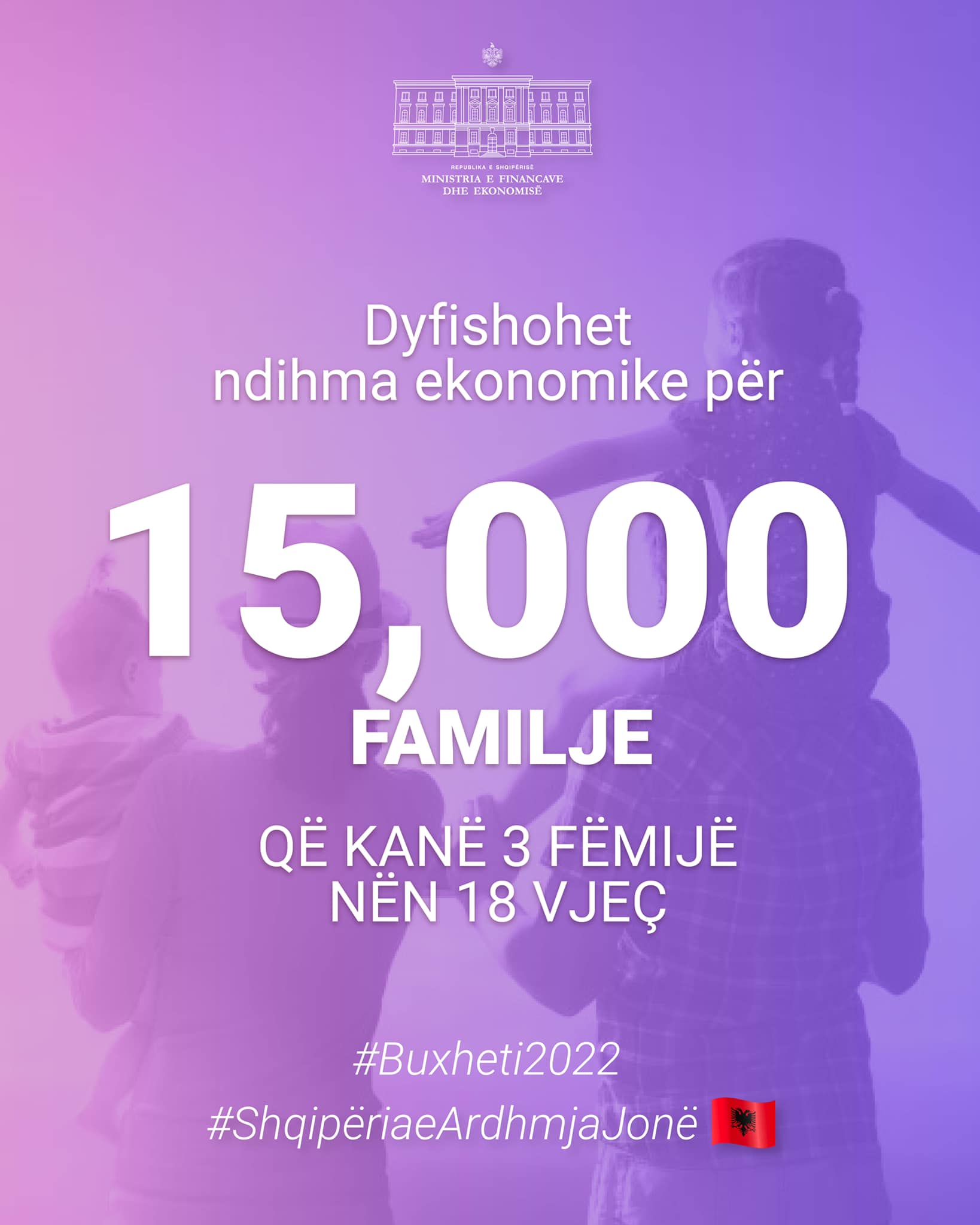 Kryeministri Edi Rama me anë të një postimi në rrjete sociale ka bërë me dije se në vitin 2022 së bashku me buxhetin do të dyfishohet edhe ndihma ekonomike për 15 mijë familje që kanë 3 fëmijë nën 18 vjeç.