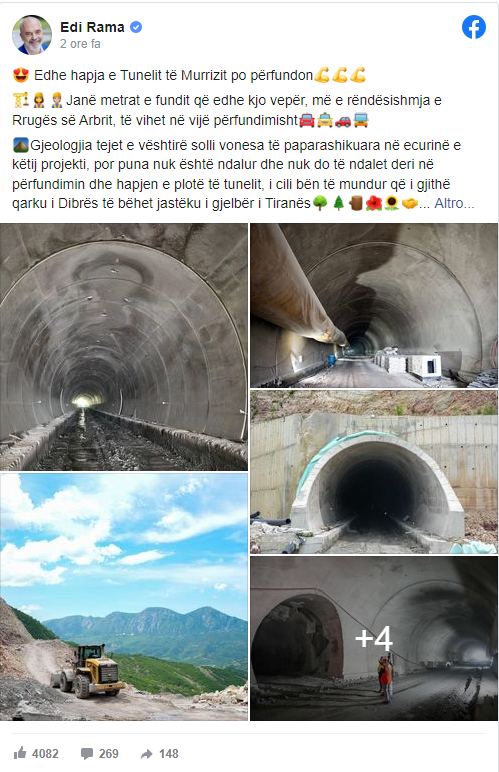 “Edhe hapja e Tunelit të Murrizit po përfundon. Janë metrat e fundit që edhe kjo vepër, më e rëndësishmja e Rrugës së Arbrit, të vihet në vijë përfundimisht. Gjeologjia tejet e vështirë solli vonesa të paparashikuara në ecurinë e këtij projekti, por puna nuk është ndalur dhe nuk do të ndalet deri në përfundimin dhe hapjen e plotë të tunelit, i cili bën të mundur që i gjithë qarku i Dibrës të bëhet jastëku i gjelbër i Tiranës”, shkruan Rama.