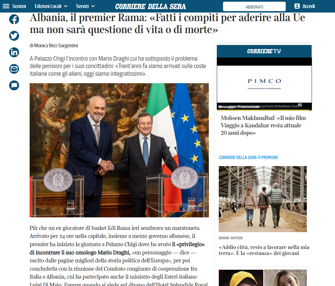 Rama për “Corriere della Sera”: Integrimi varet nga BE, por nuk është çështje jetë a vdekje