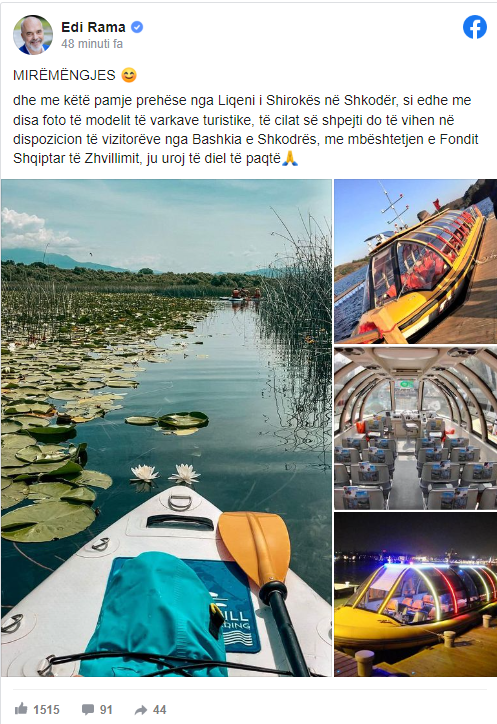“Mirëmëngjes, dhe me këtë pamje prehëse nga Liqeni i Shirokës në Shkodër, si edhe me disa foto të modelit të varkave turistike, të cilat së shpejti do të vihen në dispozicion të vizitorëve nga Bashkia e Shkodrës, me mbështetjen e Fondit Shqiptar të Zhvillimit, ju uroj të diel të paqtë”- shkruan Rama.