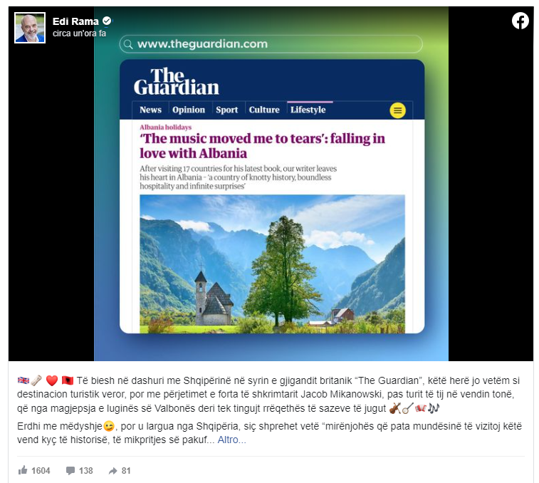 Kryeministri Edi Rama mesditën e kësaj të premte ka reaguar në lidhje me artikullin që është publikuar së fundmi për Shqipërinë në median britanike “The Guardian”.