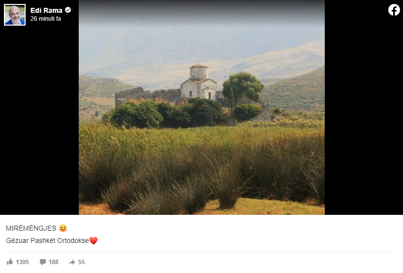 “Gëzuar Pashkët Ortodokse”, shkruan Rama në postimin e tij në “facebook” shoqëruar me një foto kishe.