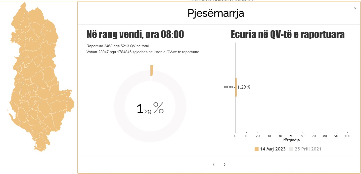 Nga 5213 QV gjithsej deri më tani në Komisionin qendror të zgjedhjeve kanë raportuar për pjesëmarrjen 2468 qendra votimi. Pjesëmarrja deri në orën 8:00 ishte 1.29%.