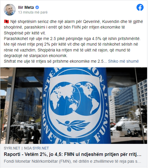 Nëpërmjet rrjetit social “Facebook”, Meta njofton se vendi ynë ka rritjen më të ulët në rajon, e cila mund të degradojë deri në stanjacion ekonomik. Kjo sipas tij duhet të jetë një shqetësim serioz për qeverinë dhe Kuvendin.