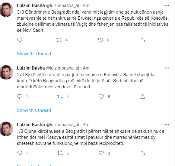 Përmes një reagimi në Twitter Basha tha se e shkuara nuk kthehet më dhe se marrëdhëniet mes Kosovës dhe Serbisë duhet të funksionojnë mbi baza reciprociteti, që është një e drejtë e patjetërsueshme e Kosovës.