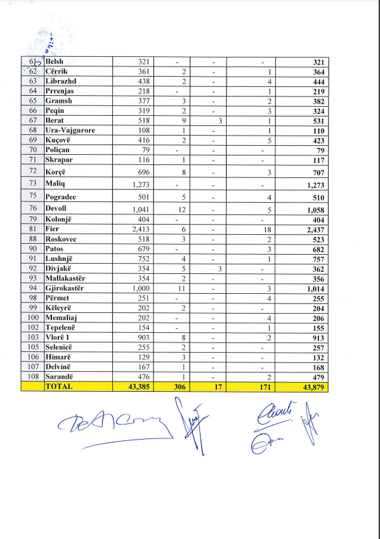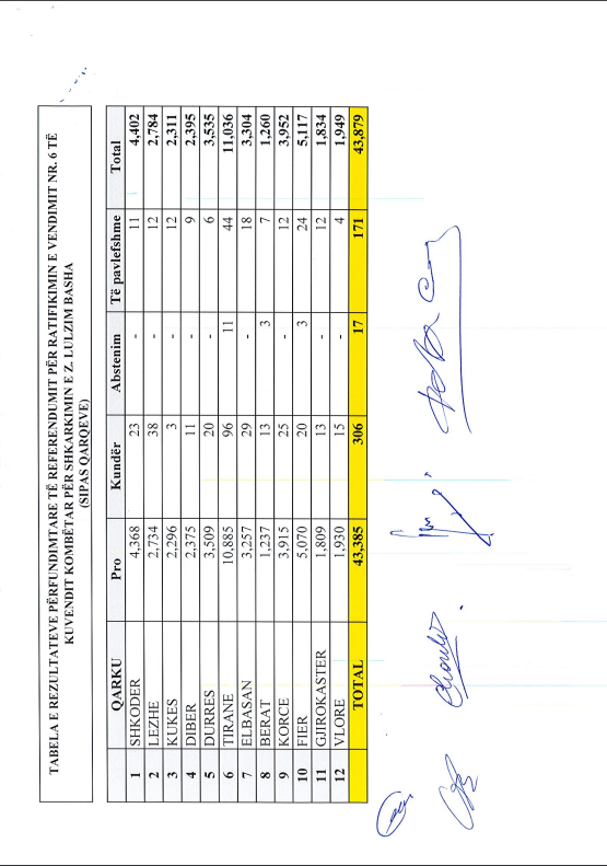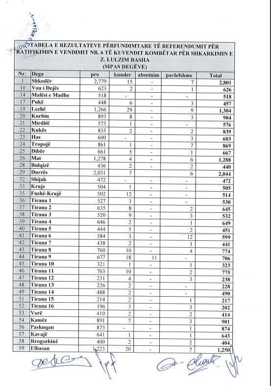 Komisioni i Organizimit dhe Operacioneve Elektorale i ngritur nga Sali Berisha dhe mbështetësit e tij, kanë publikuar rezultatin përfundimtar mbi pjesëmarrjen dhe votimin në referendumin për shkarkimin e Lulzim Bashës. Sipas tyre, morën pjesë 43,879 anëtar, ndërsa pro shkarkimit të kryedemokratit ishin 43,385.