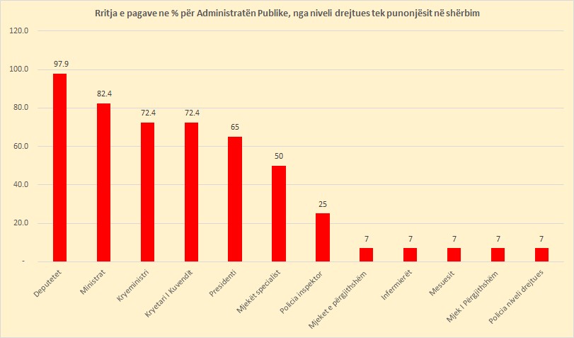 Reforma e re e pagave rriti me tej pabarazinë këtë vit buxhetor, teksa punonjësve në shërbimet themelore të vendit, mësuesit, mjekët dhe infermierët dhe trupa policore në terren morën vetëm 7 për qind rritje të pagës, ndërsa funksionet e larta të qeverisëse, deputetet, ministrat dhe zv/ ministrat përfituan rritje të pagës nga 50-deri 98 për qind sipas vendimeve të fundit me reformën e pagave që po diskutohet në Kuvend.