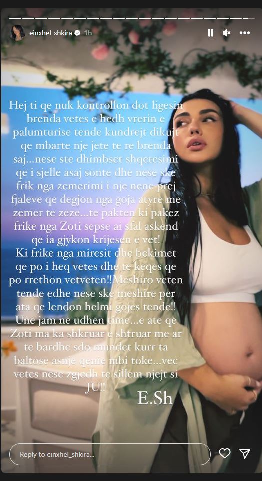 Mirëpo, Einxhel merr vazhdimisht komente të shumta, madje edhe negative. Së fundmi, ajo ka vendosur t’i kthehet njërës prej ndjekësve përmes një postimi në Instastory. Ndër të tjera, moderatorja thotë se nuk dëshiron që fëmija i saj të ndjejë energjinë negative që i dhurojnë, por një ditë ajo do të flasë për të gjitha ato gra të cilat kanë vuajtur gjatë shtatzënisë së tyre.