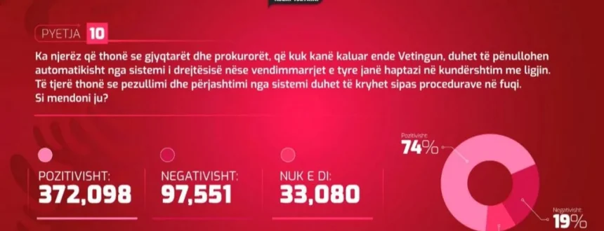Pyetja 10: Ka njerëz që thonë se gjyqtarët dhe prokurorët që nuk kanë kaluar ende Vetingun, duhet të pezullohen automatikisht nga sistemi i drejtësisë nëse vendimmarrjet e tyre janë haptazi në kundërshtim me ligjin. Të tjerë thonë se pezullimi dhe përjashtimi nga sistemi duhet të kryhet sipas procedurave në fuqi. Si mendoni ju?
