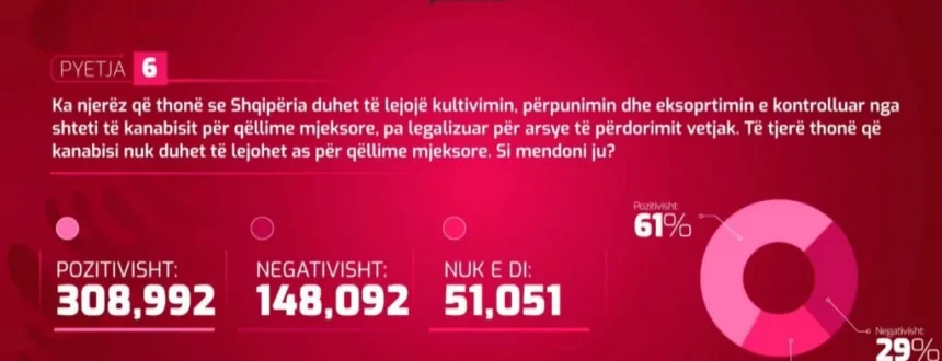Pyetja 6: Ka njerëz që thonë se Shqipëria duhet të lejojë kultivimin, përpunimin dhe eksportimin e kontrolluar nga shteti të kanabisit për qëllime mjekësore, pa e legalizuar për arsye të përdorimi vetjak.Të tjerë thonë që kanabisi nuk duhet të lejohet as për qëllime mjekësore. Si mendoni ju?