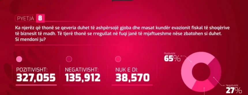 Pyetja 8: Ka njerëz që thonë se qeveria duhet të ashpërsojë gjobat dhe masat kundër evazionit fiskal të shoqërive të biznesit të madh. Të tjerë thonë se rregullat në fuqi janë të mjaftueshme nëse zbatohen si duhet. Si mendoni ju?