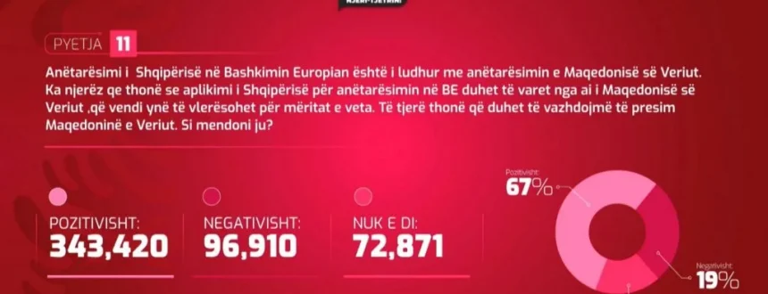 Pyetja 11: Anëtarësimi i Shqiperisë në Bashkimin Europian është i lidhur me anëtarësimin e Maqedonisë së Veriut. Ka njerëz që thonë se aplikimi i Shqipërisë për anëtarësim në BE duhet të ndahet nga ai i Maqedonisë së Veriut, që vendi ynë të vlerësohet për meritat e veta. Të tjerë thonë që duhet të vazhdojmë të presim Maqedoninë e Veriut. Si mendoni ju?Janë përgjigjur pozitivisht 343.402