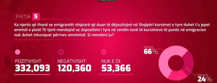 Pyetja 5: Ka njerëz që thonë se emigrantët shqiptarë që duan të depozitojnë në Shqipëri, kursimet e tyre duhet t’u jepet amnisti e plotë. Të tjerë thonë se depozitimet në vendin tonë të kursimeve të punës në emigracion nuk duhen inkurajuar përmes amnistisë. Si mendoni ju?