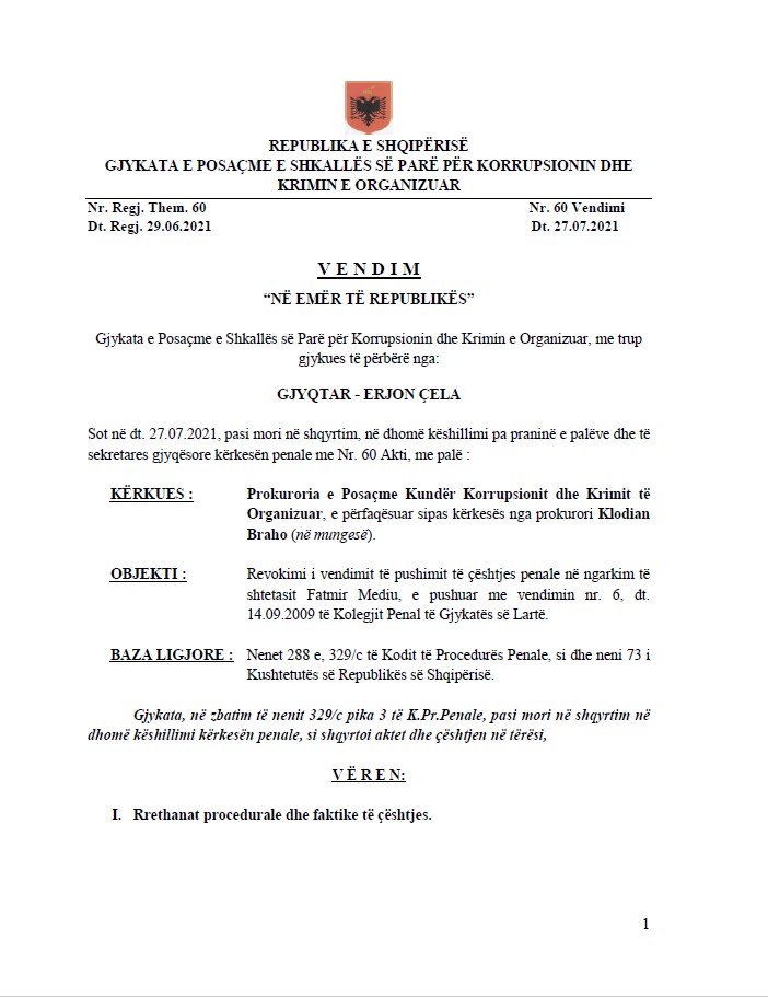 “Me referimin në parashikimin e pikës 1, shkronja b), të nenit 46, të ligjit 98/2016 “Për Organizimin e Pushtetit Gjyqësor në Republikën e Shqipërisë” si dhe, në interesin e treguar nga media, komunikohet në mënyrë të përmbledhur se, sot më datë 24.09.2021, në Gjykatën e Posaçme të Apelit për Korrupsionin dhe Krimin e Organizuar, mbi ankimin e Prokurorit të Posaçëm dhe të trashëgimtarëve të viktimës E.D., u zhvillua seanca gjyqësore në dhomë këshillimi, për çështjen penale nr. 212 akti, datë 03.09.2021 regjistrimi, ku Gjykata vendosi, të ndryshojë vendimin nr. 60, datë 27.07.2021 të Gjykatës së Posaçme të Shkallës së Parë për Korrupsionin dhe Krimin e Organizuar, duke pranuar kërkesën e Prokurorit të Posaçëm dhe revokoi vendimin e pushimit nr. 6, datë 14.09.2009 të Kolegjit Penal të Gjykatës së Lartë, duke i kthyer aktet Prokurorit të Posaçëm për të proceduar”, thuhet në vendimin e GJKKO.