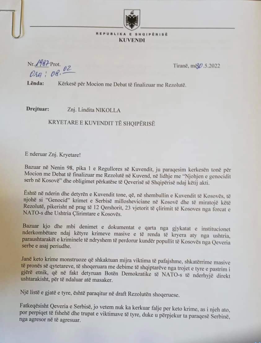 Nëpërmjet një postimi në rrjete sociale, Shehu bën me dije se Rithemelimi ka dorzuar në Kuvend këtë rezolutë, ku dhe pritet të diskutohet dhe miratohet në parlament.