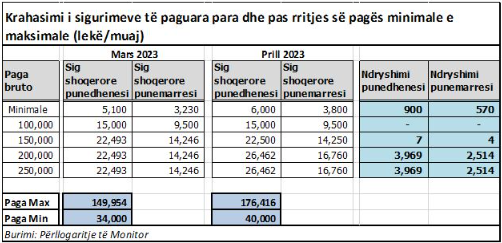 Rritja e vazhdueshme e pagës minimale, e shoqëruar me atë të pagës maksimale për efekt të pagimit të sigurimeve shoqërore në fakt ka shtuar barrën fiskale te punonjësit me paga relativisht të larta, të cilët penalizohen edhe nga tatimi i lartë i pagës prej 23% mbi kufirin e 200 mijë lekëve (ky kufi u rrit nga 150 në 200 mijë lekë në prill të vitit të kaluar).