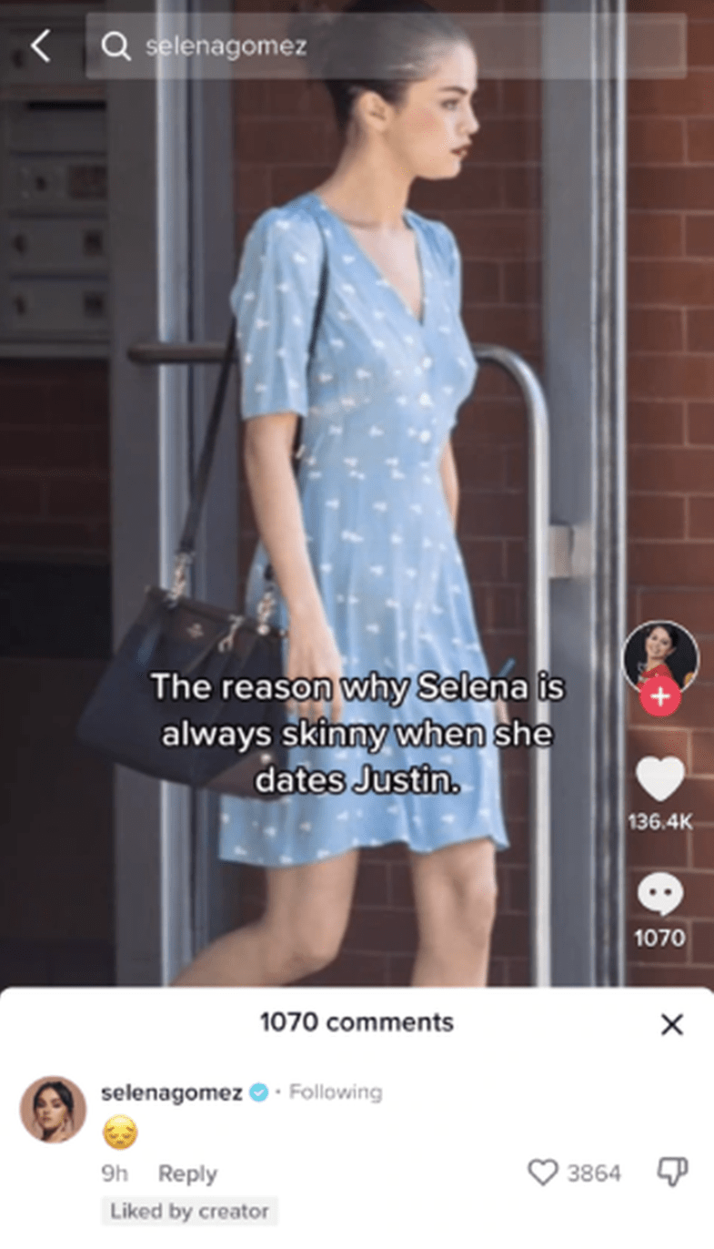 Rishtazi, një llogari ka postuar një video në rrjetin social TikTok, në të cilën paraqiteshin disa foto të saj, me mbishkrimin: “Arsyeja pse Selena ishte gjithmonë e dobët gjatë lidhjes me Justin”.