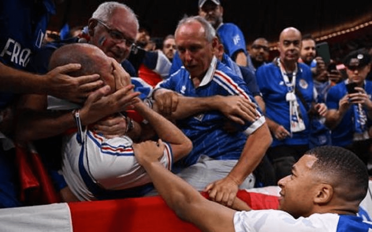 Më pas e përkëdheli si kërkim-faljeje. Tifozi e vlerësoi gjestin e kampionit francez, edhe pse ishte ende shumë i lënduar nga topi i tmerrshëm që e goditi në fytyrë.
