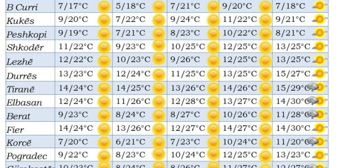 “Java që presim përpara parashikohet një javë me “shije” vere pasi vendi ynë pritet të ndikohet nga kushtet të qëndrueshme atmosferike me plot orë me diell si dhe temperatura në rritje.  Në këtë mënyrë siç u theksua edhe më lartë duke nisur nga dita e Hënë (nesër) deri dhe ditën e Enjte moti parashikohet i kthjellët në pjesën më të madhe të territorit”.