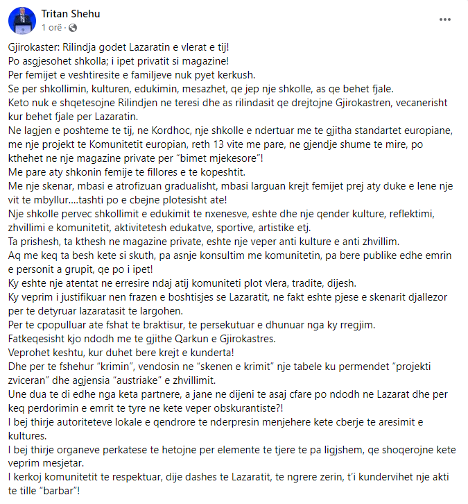 Përmes një postimi në ‘Facebook’, Shehu akuzon qeverinë se kjo e fundit po godet Lazaratin dhe vlerat e tij.