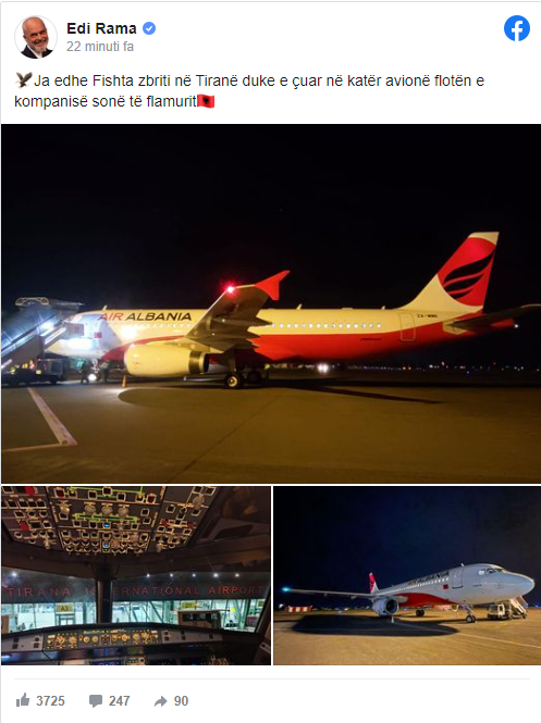 “Ja edhe Fishta zbriti në Tiranë duke e çuar në katër avionë flotën e kompanisë sonë të flamurit”, shkruan Rama.
