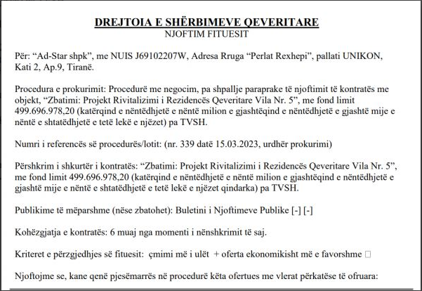 Duket se shpenzimet marramendëse të qeverisë Rama nuk kanë të ndalur. Plot 5 milionë euro do të shpenzohen për rikonstruksionin e vilës qeveritare nr.5. Siç shihet edhe nga dokumenti, Drejtoria e Shërbimeve Qeveritare, ka finalizuar procedurën e prokurimit me negocim, pa shpallje paraprake të njoftimit të kontratës.