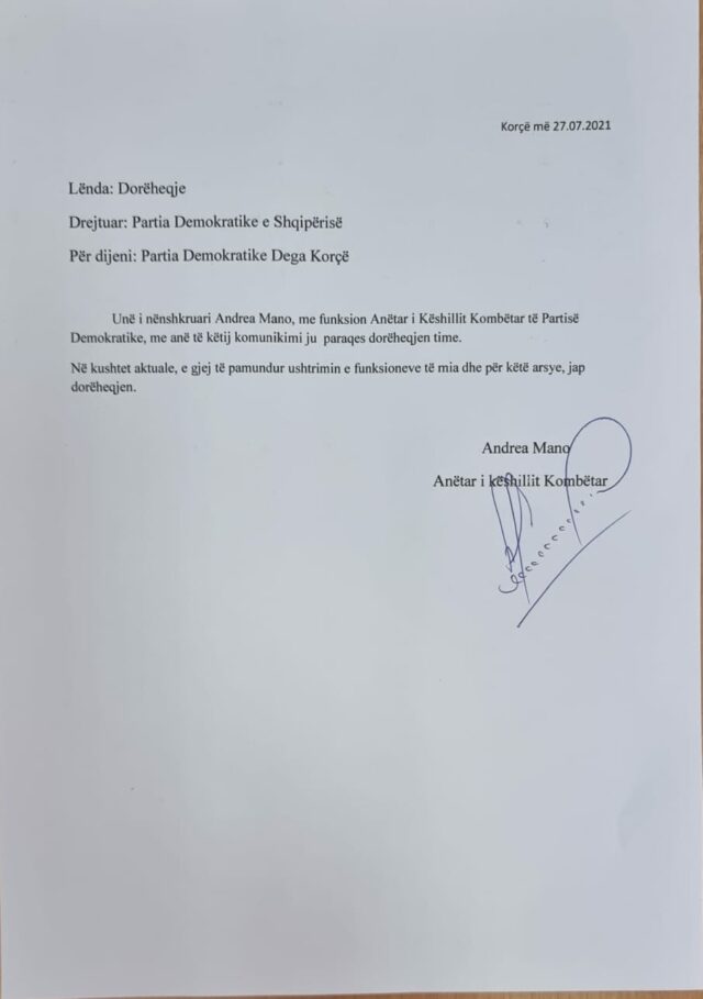 Unë kam dhçnë dorëheqjen si kryetar i PD dega Korçë dhe sot po jap dorëheqjen si anëtar i Këshillit Kombëtar të PD. 14 anëtarë të kryesisë, qëëjanë këtu me mua sot, midis tyre edhe Sekretari i degës se Korçës , Devis Osmani qe ka punuar pranë meje për 8 vite , largohen me dorëheqje të parevokueshme nga ky funksion.