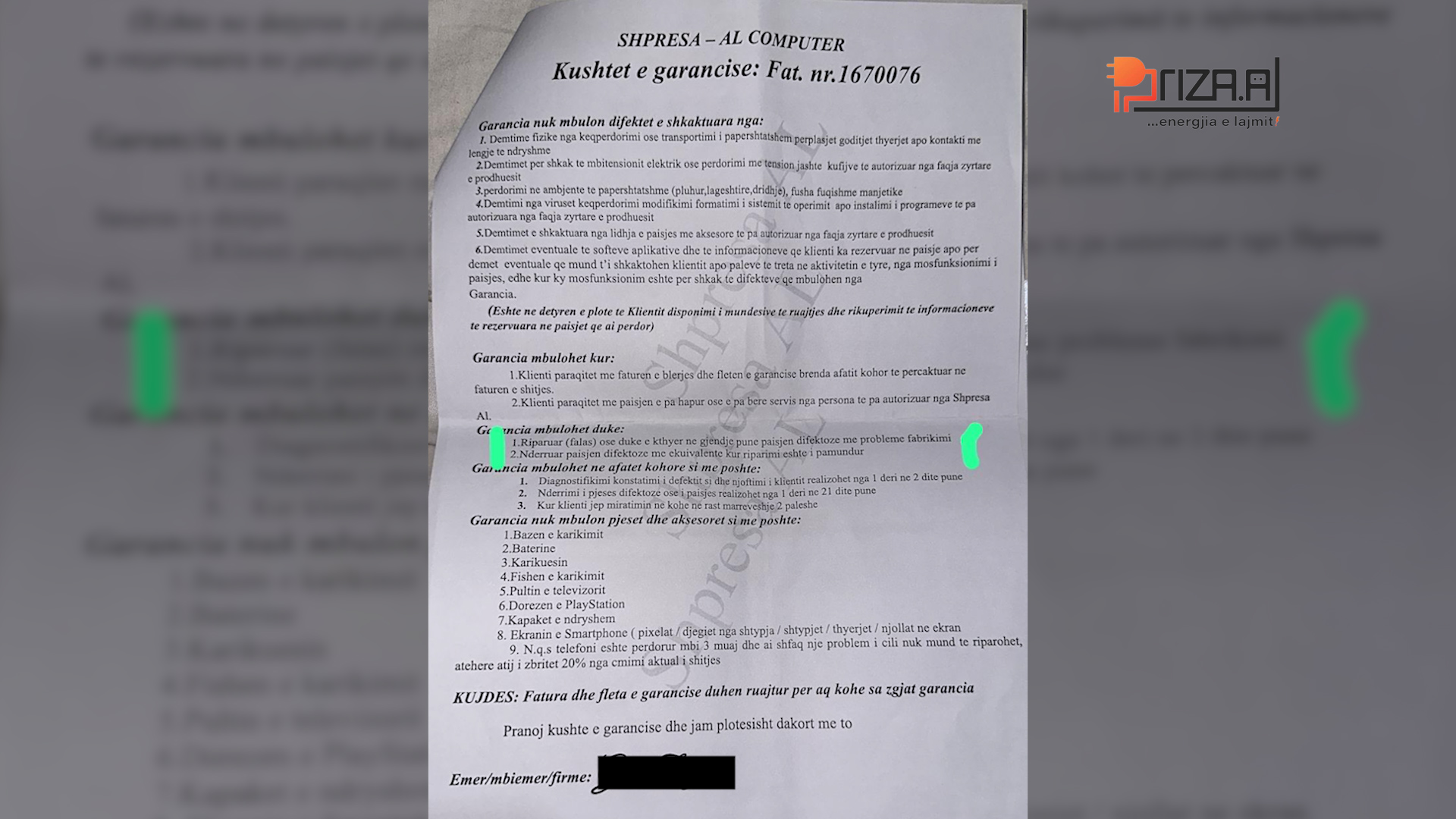 Po ashtu bashkë me telefonin e ri në kuti, klienti mori edhe fletën e garancisë. Kjo fletë garancie e lëshuar nga “Shpresa Al” thotë se garancia është 24 muaj. Pra nga data e blerjes që është 30.07.2022 e deri më 30.07.2024 shitësi, në këtë rast “Shpresa Al” përgjigjet për problemet që mund të ketë aparati si pasojë e fabrikës ose problemeve të tjera të përcaktuara në fletën e garancisë.
