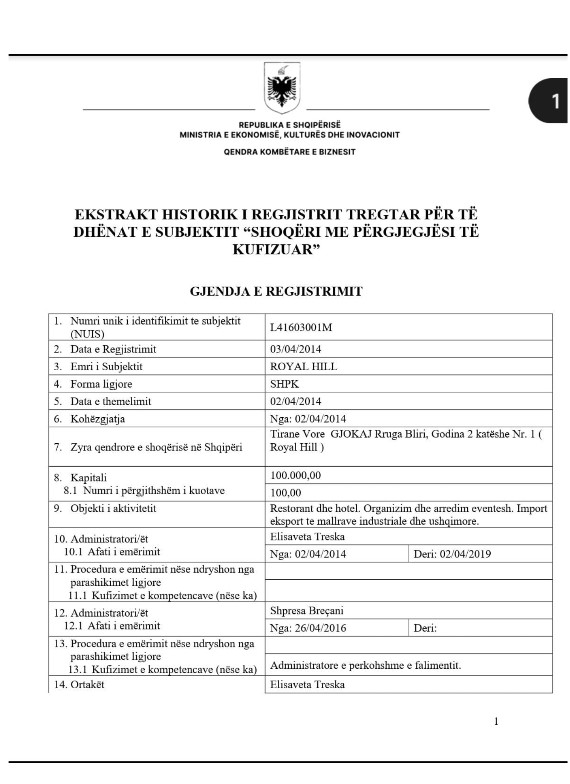 Në lidhje me shkrimet e rreme që kanë qarkulluar mbi bashkëortakërinë time dhe rolin tim si administratore në shoqërinë ‘ROYAL HILL’ sh.p.k., sqaroj se nuk kam qenë kurrë ortake e kësaj shoqërie, as administratore e emëruar nga pronarët e saj.