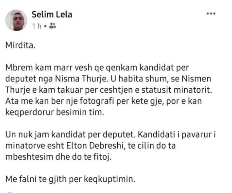 “Mbrëmë kam marrë vesh që qenkam kandidat për deputet nga “Nisma Thurje”. U habita shumë, se “Nismën Thurje” e kam takuar për çështjen e statusit të minatorit. Ata më kanë bërë një fotografi për këtë gjë, por kanë keqpërdorur besimin tim. Unë nuk jam kandidat për deputet. Kandidati i pavarur i minatorëve është Elton Debreshi, të cilin do ta mbështesim dhe do të fitojë. Më falni të gjithë për keqkuptimin”.