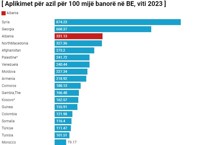Sipas Eurostat, në 2023 kanë qenë 9,145 shtetas shqiptarë që kanë aplikuar për azil në një nga shtetet e Bashkimit Europian, ose 331 aplikime për 100 mijë banorë, nga 17 aplikime për 100 mijë banorë, që është mesatarja e të gjithë aplikimeve në BE. Të dhënat e Eurostat për aplikimet për azil nga të gjitha shtetet, të përpunuara nga Monitor në raport me popullsinë përkatëse tregojnë se Shqipëria ishte e treta në botë për aplikimet e larta për azil në raport me popullsinë (shiko grafikun Aplikimet për azil për 100 mijë banorë në BE, viti 2023). Në vend të parë është Siria, një shtet që prej vitesh po vuan pasojat e luftës civile. Ky shtet kishte 874 aplikime për 100 mijë banorë në vendet e BE-së në 2023. Sirianët i ikin luftës. Deri në dhjetor 2022, sipas vlerësimeve nga UNCHR kanë humbur jetën mbi 580,000 persona; 13 milionë sirianë janë zhvendosur dhe 6.7 milionë refugjatë të detyruar të largohen nga Siria. Shteti i dytë është Gjeorgjia, që kishte 668 aplikime për azil në BE për 100 mijë banorë. Gati gjysma e aplikimeve janë në Gjermani, të ndjekura nga Franca dhe Italia. Sipas mediave të huaja aplikimet janë kryesisht për arsye ekonomike, ndërsa në vitin 2023 ato ranë me 12%, kryesisht pasi Gjermania e futi Gjeorgjinë në listën e vendeve të sigurta dhe përshpejtoi procedurat e depërtimit.