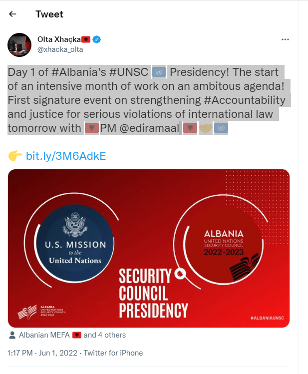 Ministrja e punëve të jashtme, Olta Xhaçka ka reaguar në lidhje me marrjen e presdencës e Këshillit të Sigurimit të OKB-së.