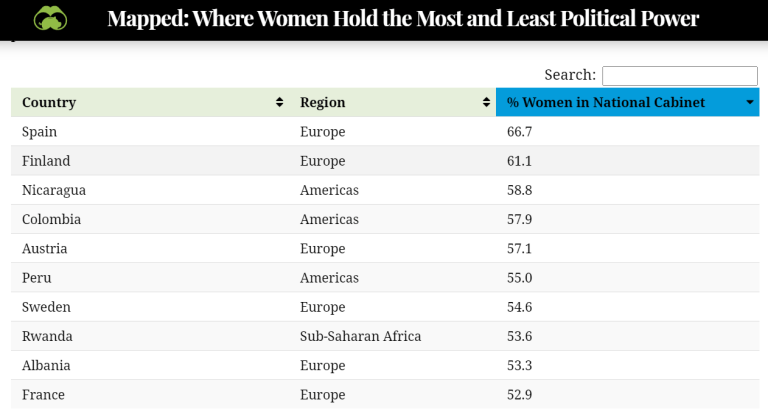 Në Shqipëri, 53% e qeverisë përbëhet nga ministre gra, duke u renditur ndër 10 vendet e para në botë, ku femrat kanë pushtet më të madh politik. Harta është publikuar së fundmi nga Visual Capitalist, bazuar në të dhënat e UN Women dhe The Inter-Parliamentary Union (IPU).