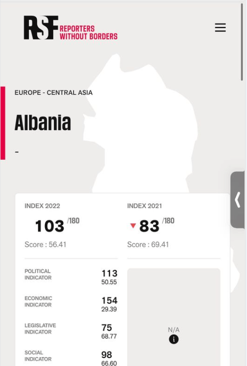 Në këtë indeks, Kosova sivjet radhitet në pozitën e 61-të, në krahasim me pozitën e 78-të, që ka mbajtur në vitin 2021. Trendi i rritjes vjen pas rënies që ka shënuar vitin e kaluar – për tetë pozita – në krahasim me renditjen e vitit 2020. Por, edhe përkundër përparimit, Kosova vazhdon të mbetet në mesin e vendeve me “situatë problematike”, siç e vlerësojnë Reporterët pa Kufij.