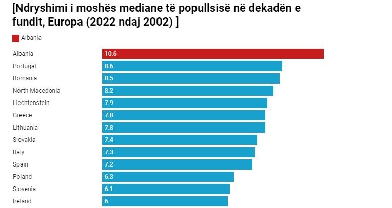 Mosha mediane e popullsisë së Shqipërisë arriti në 38.2 vjet në vitin 2022, duke u renditur bashkë me Kosovën në mesin e vendeve me popullata me të reja se shtetet e tjera të Europës, sipas të dhënave të Eurostat, por në dy dekadat e fundit vendi ynë është mplakur me ritmet më të larta. Në vitin 2002 mosha mediane e Shqiptarëve ( vlera që ndan gjysmën më të vjetër nga gjysma më e re e popullsisë) ishte 27.6 vjeç. Gjatë dy dekadave 2002-2022 shihet se popullsia e Shqipërisë është plakur me 10.6 vite norma më e lartë nga të gjithë vendet e Europës, e cila gjatë kësaj periudhe është plakur me vetëm 4.7 vite.