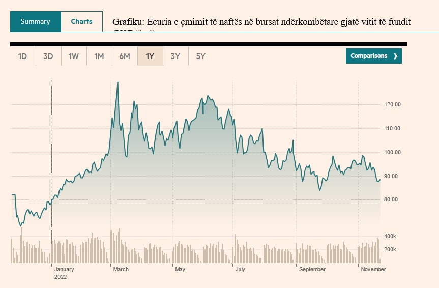 Naftë në bursa arriti në mbi 130 dollarë për fuçi në mars, me fillimin e luftës, duke rënë lehtë më pas, për të kulmuar sërish në qershor në rreth 120 dollarë për fuçi. Më pas tendenca ka qenë në zbritje të vazhdueshme për të arritur aktualisht në rreth 90 dollarë për fuçi, në nivelet e paraluftës.