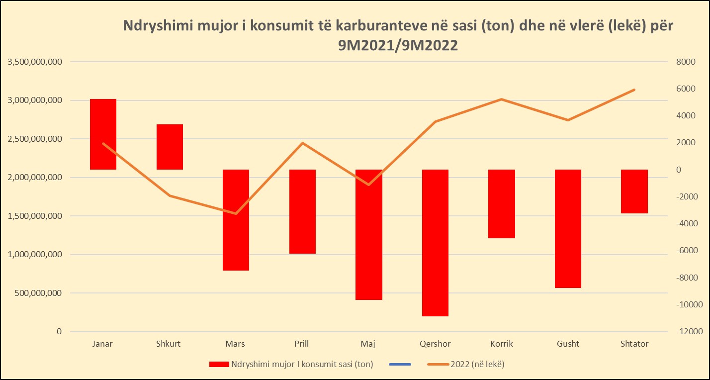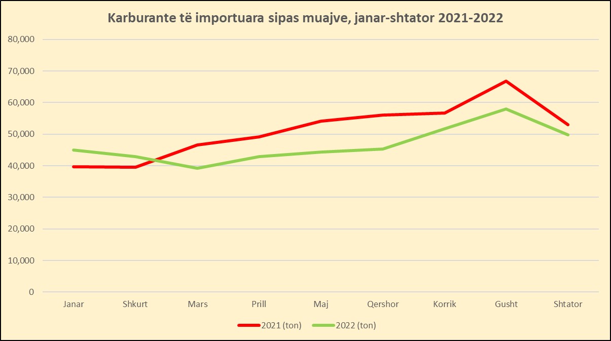 Rritja e fortë e çmimeve e ndikoi ndjeshëm konsumin. Që nga marsi, importet e karburanteve, sipas të dhënave të Ministrisë së Financave shënuan rënie që luhatet mesatarisht midis 10 dhe 20% më pak (shiko grafikun: Karburante të importuara sipas muajve, janar-shtator 2021-2022).