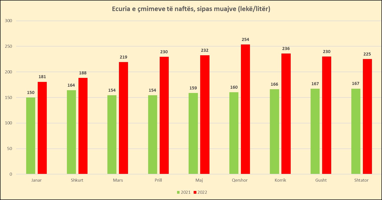 Në muajt në vijim tendenca ishte në një rënie, por të lehtë, duke arritur në shtator në 225 lekë/litër, niveli më i ulët që nga shkurti. Por sërish nafta ishte 34% më e shtrenjtë se shtatori i një viti më parë (shiko grafikun: Ecuria e çmimeve të naftës, sipas muajve)