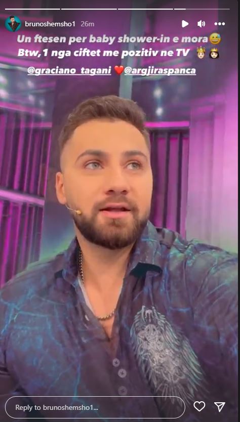 Ishte një video e publikuar nga ish-konkurrenti i “Për’puthen”, Bruno Shemsho, ajo që i bëri lëmsh të gjithë. Ai publikoi një video në ‘Instastory’ ku shfaqej së bashku me moderatoren. Gjatë videos ai shprehej: “Jemi këtu me Argjirën e cila është shtatzënë, pret një beb”, ndërsa në mbishkrimin e postimit Bruno shkruante: “Unë ftesën për baby shower-in e mora. Meqë ra fjala, një nga çiftet më pozitiv në tv.” Por gjithçka u sqarua tanimë nga vetë moderatorja e cila nuk la vend për dyshim.